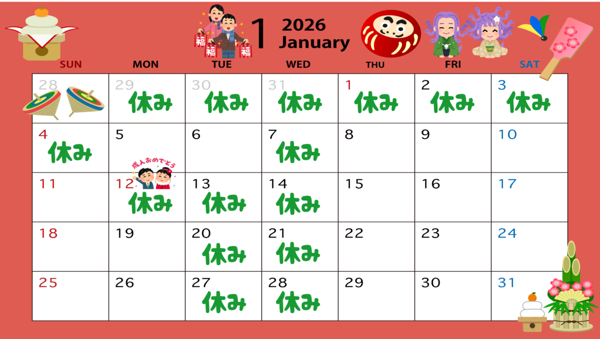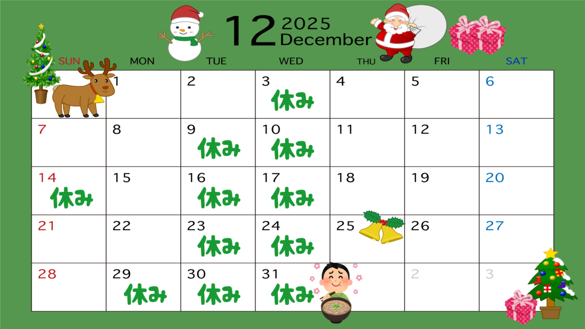 2025年12月・2026年1月の定休日についてご案内いたします。